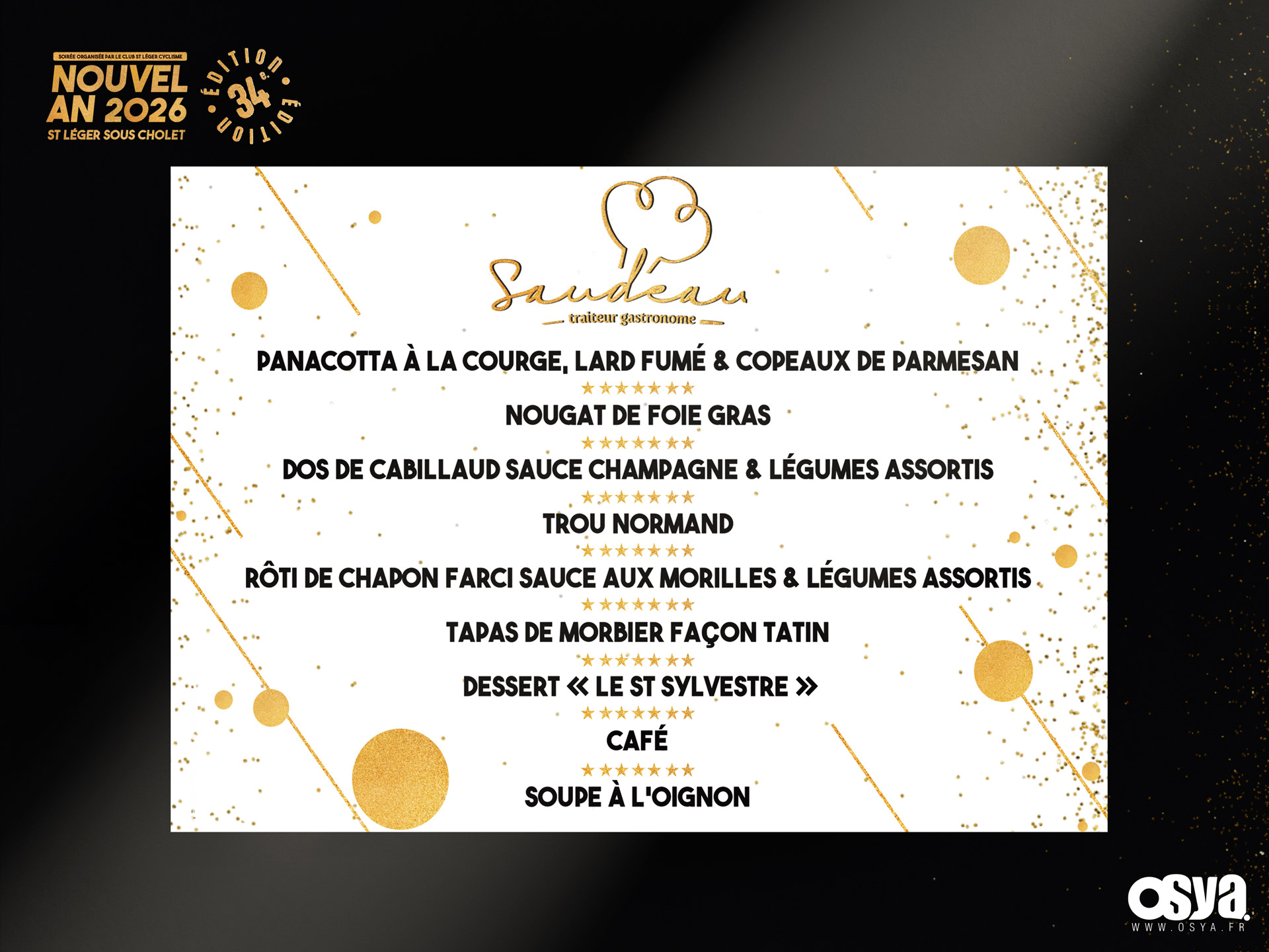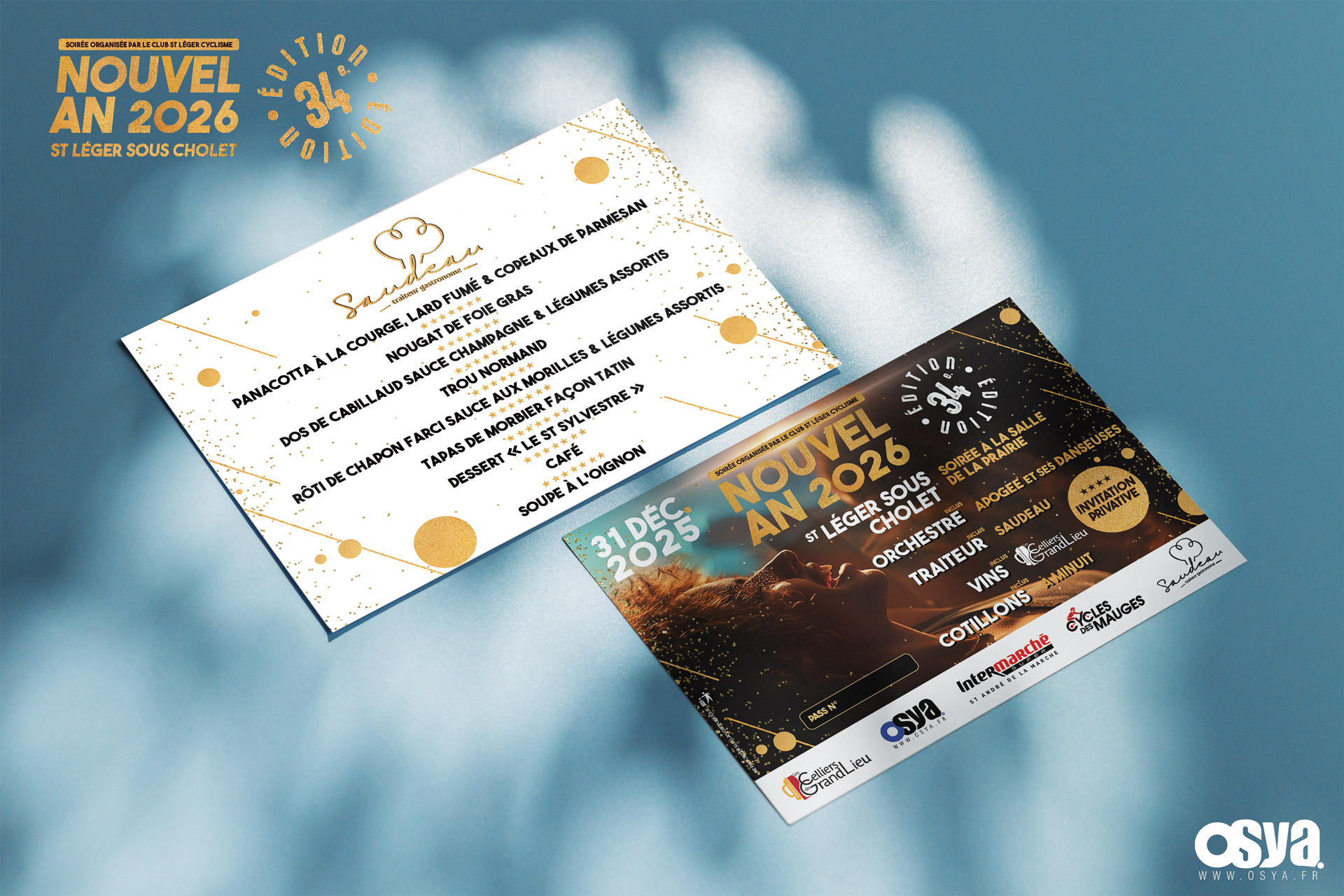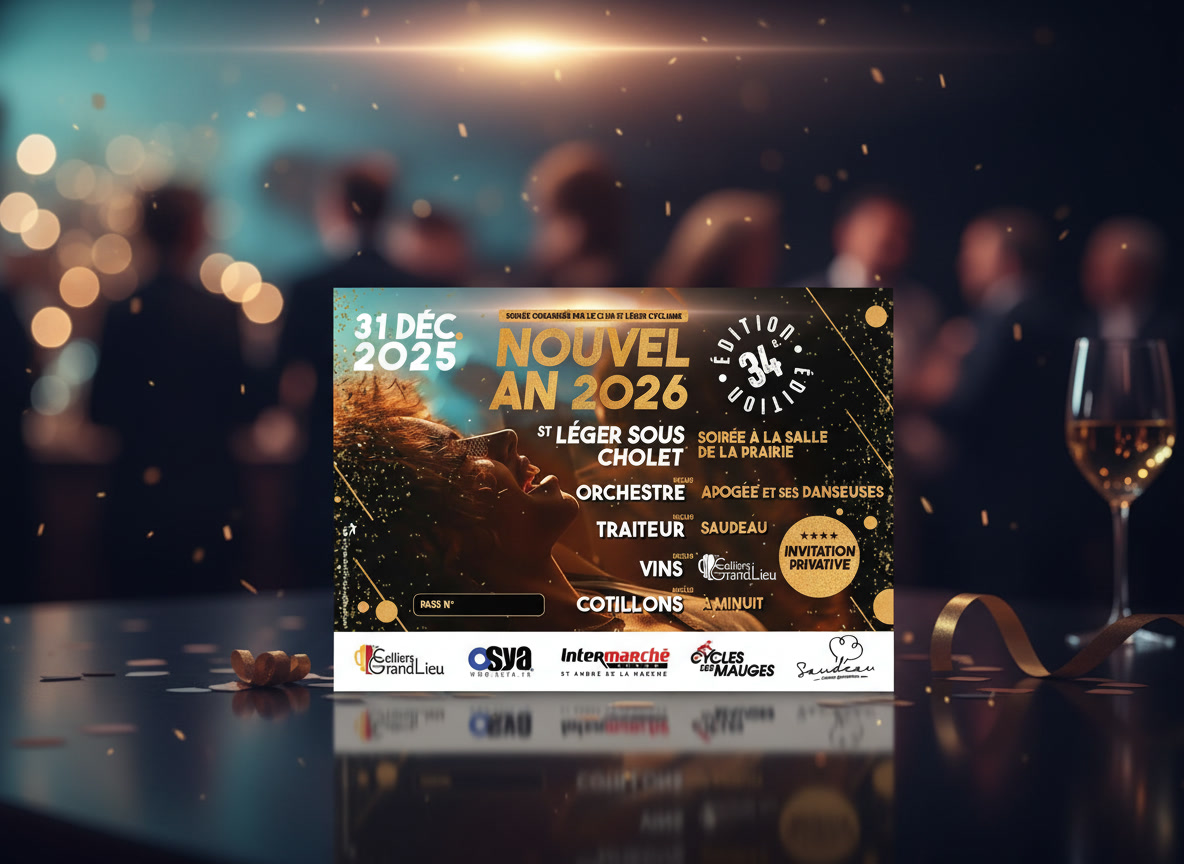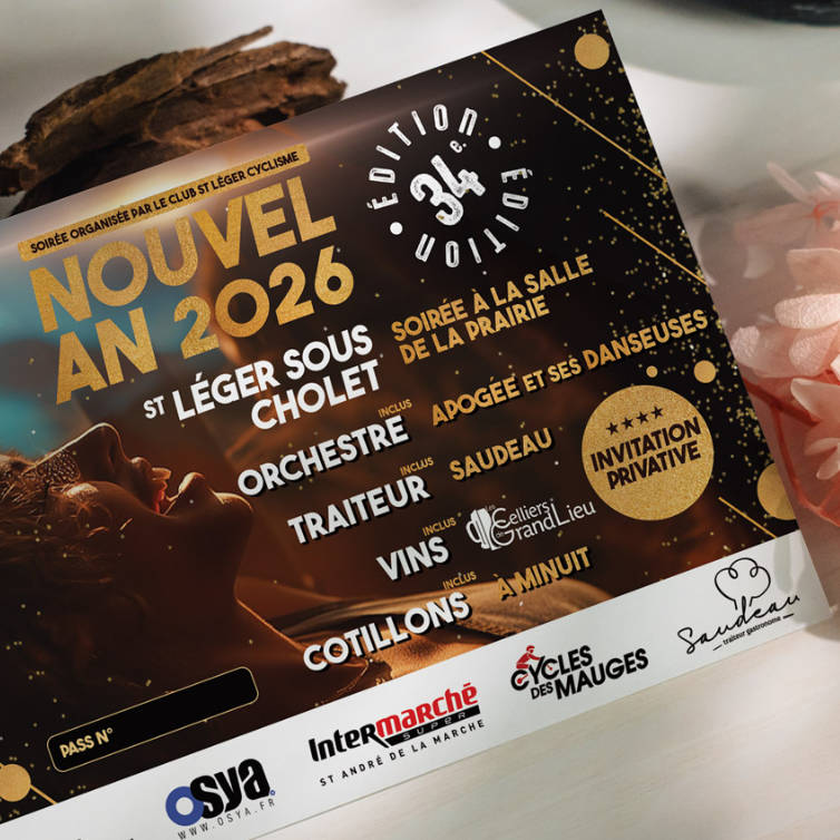 Je vous dévoile quelques créations tels que les cartes d’invitation privatives, les affiches, les menus pour la soirée du réveillon à ST LÉGER SOUS CHOLET organisée par le Club St Léger Cyclisme.